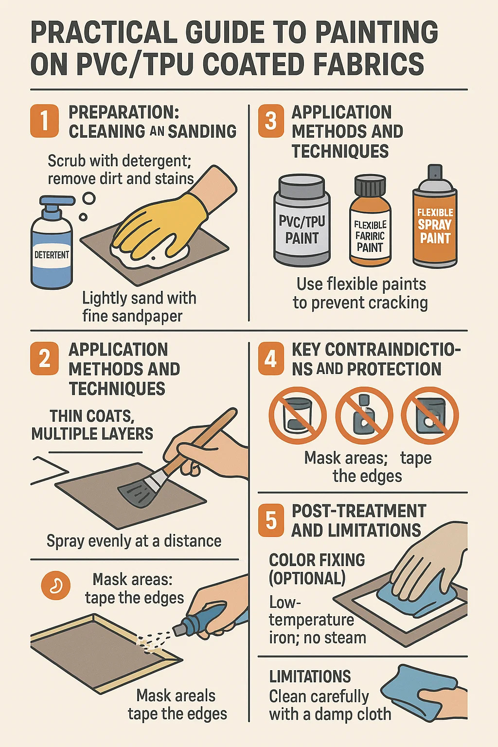 Här är en praktisk guide till att måla på PVC-belagda tyger och TPU-belagda tyger, som innehåller vanliga driftserfarenheter och försiktighetsåtgärder: