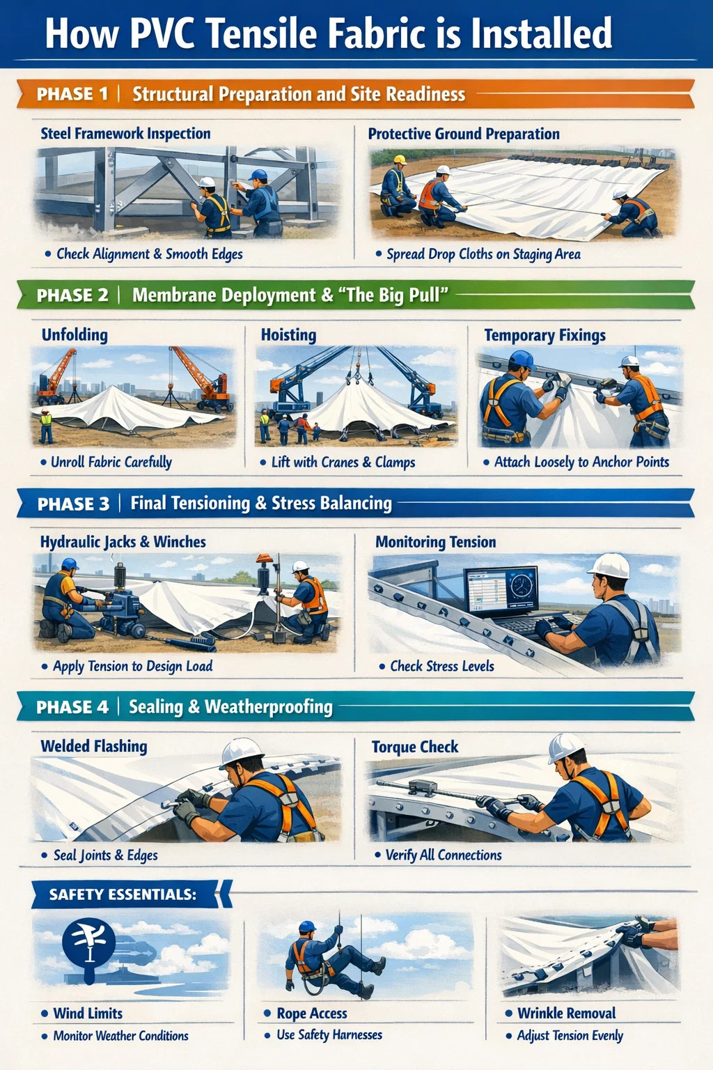 Att använda tyget är ofta den visuellt mest dramatiska delen av installationen. För storskaliga projekt som stadiontak eller flygplatsterminaler kräver detta synkroniserade kranar och en stor besättning av tekniker.