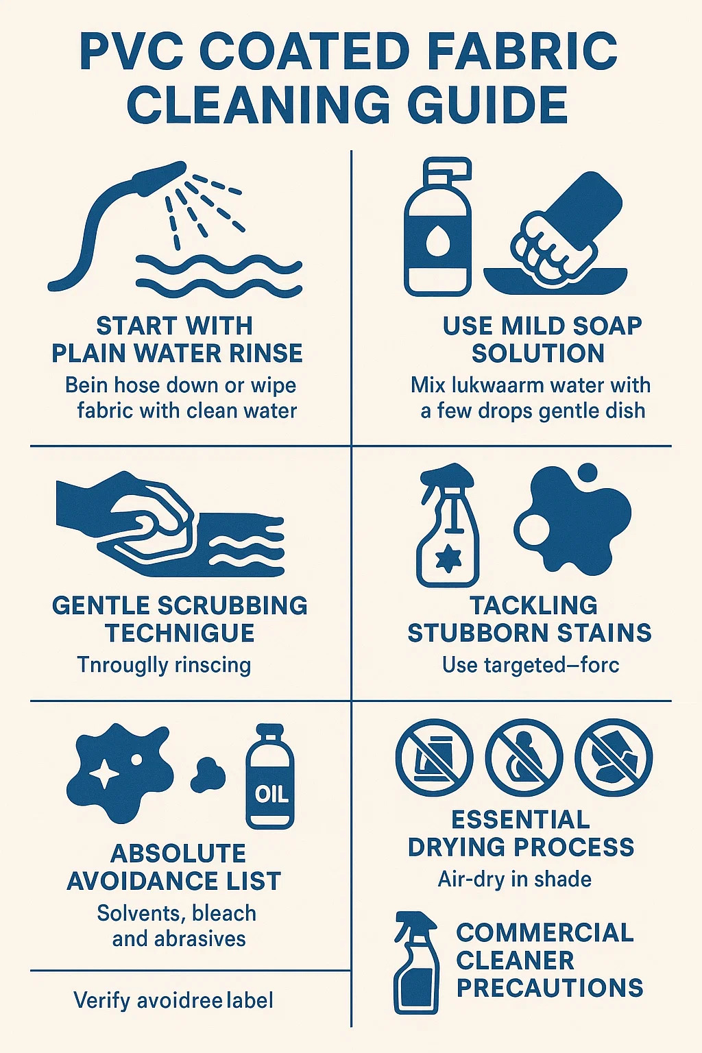 Här är en praktisk guide för rengöring PVC-belagda tyger baserat på gemensam erfarenhet och materialvård: