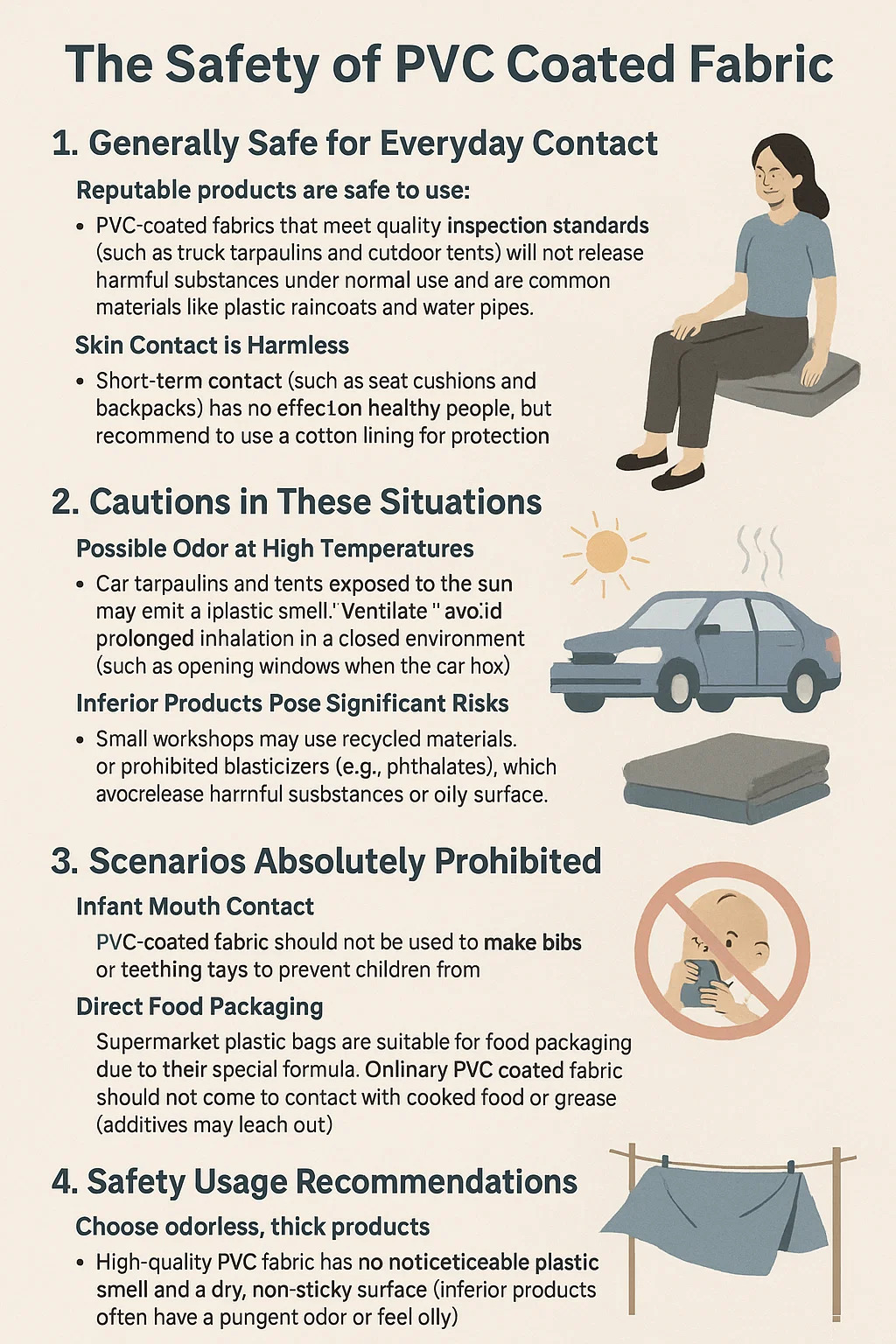 Möjlig lukt vid höga temperaturer: Bilpresenningar och tält som utsätts för solen kan avge en "plastlukt". Ventilationen är tillräcklig; undvik långvarig inandning i en sluten miljö (som att öppna fönster när bilen är varm).