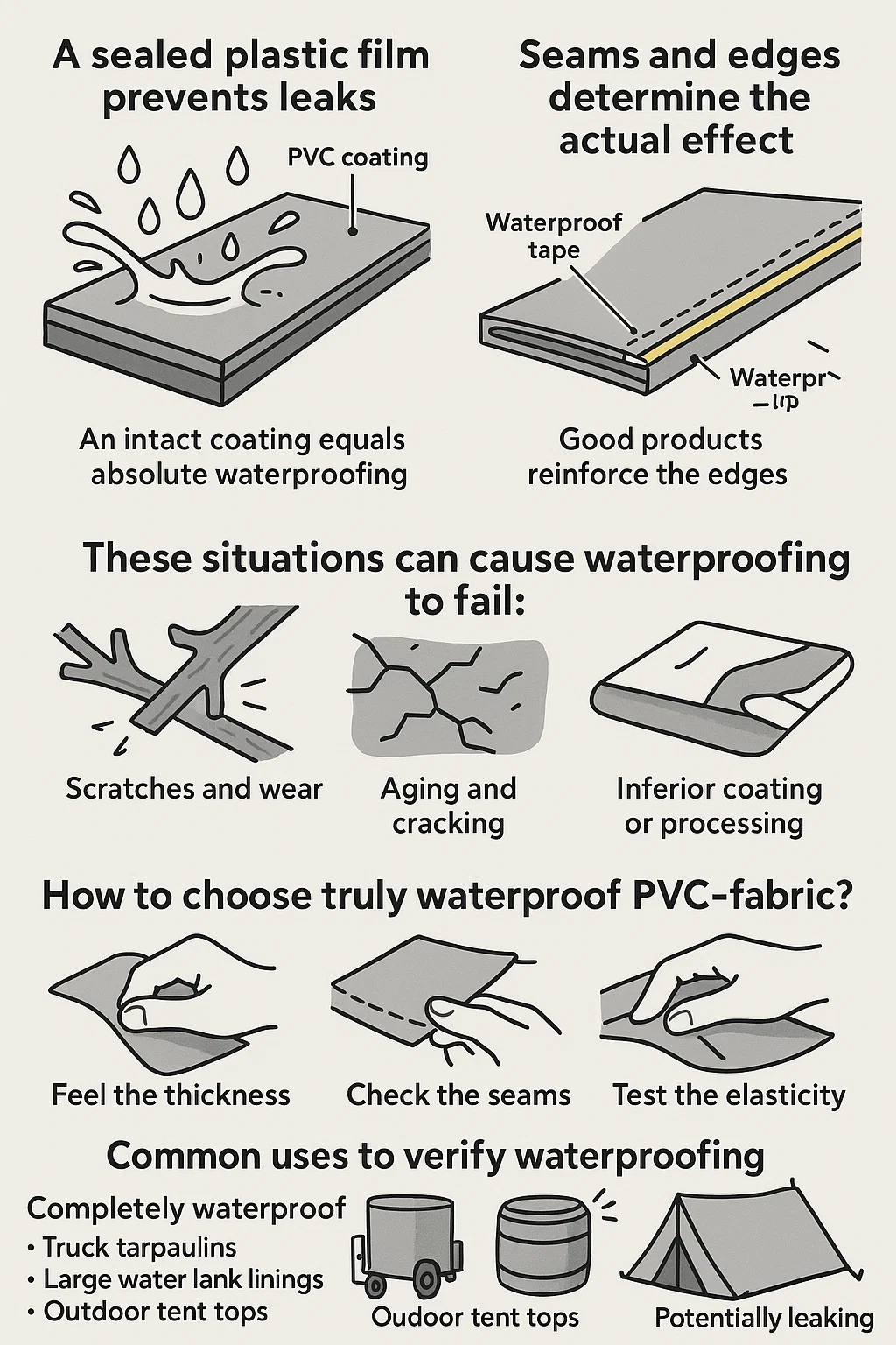 Helt vattentät: Lastbilspresenningar, stora vattentankfoder, utomhustälttoppar – dessa kräver en tjock PVC-beläggning och tätningsprocess.