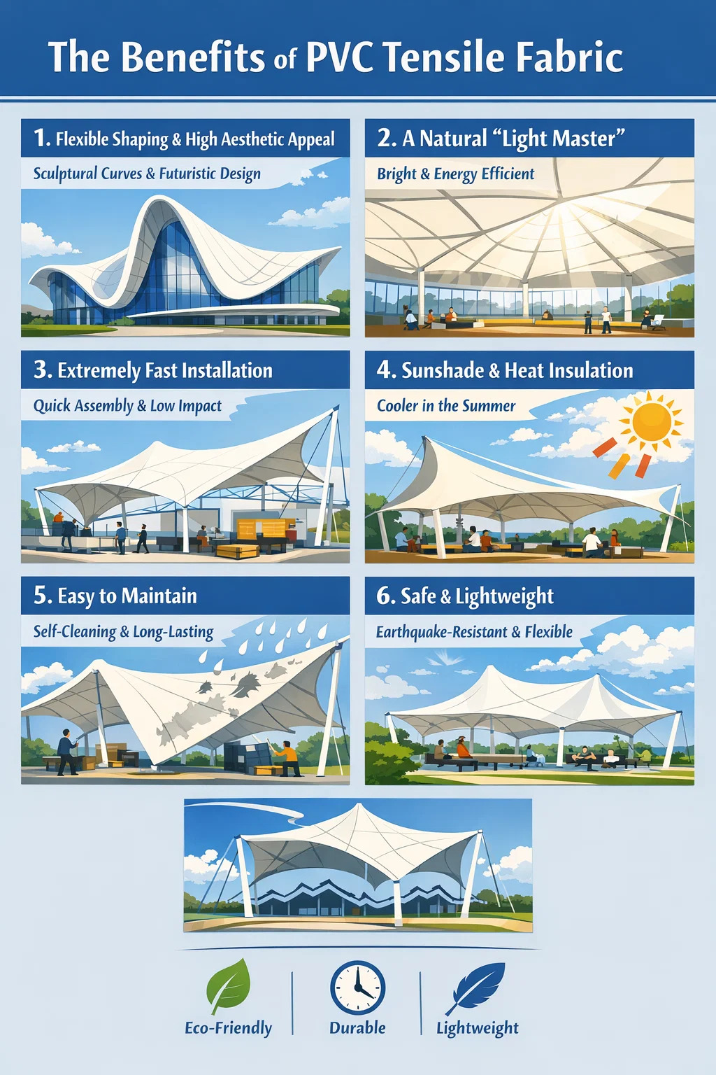 På tal om fördelarna med PVC dragtyg , dess popularitet i modern arkitektur, särskilt i arenor, utomhustorg och landskapsskuggning, härrör från dess många unika fördelar jämfört med traditionella material.