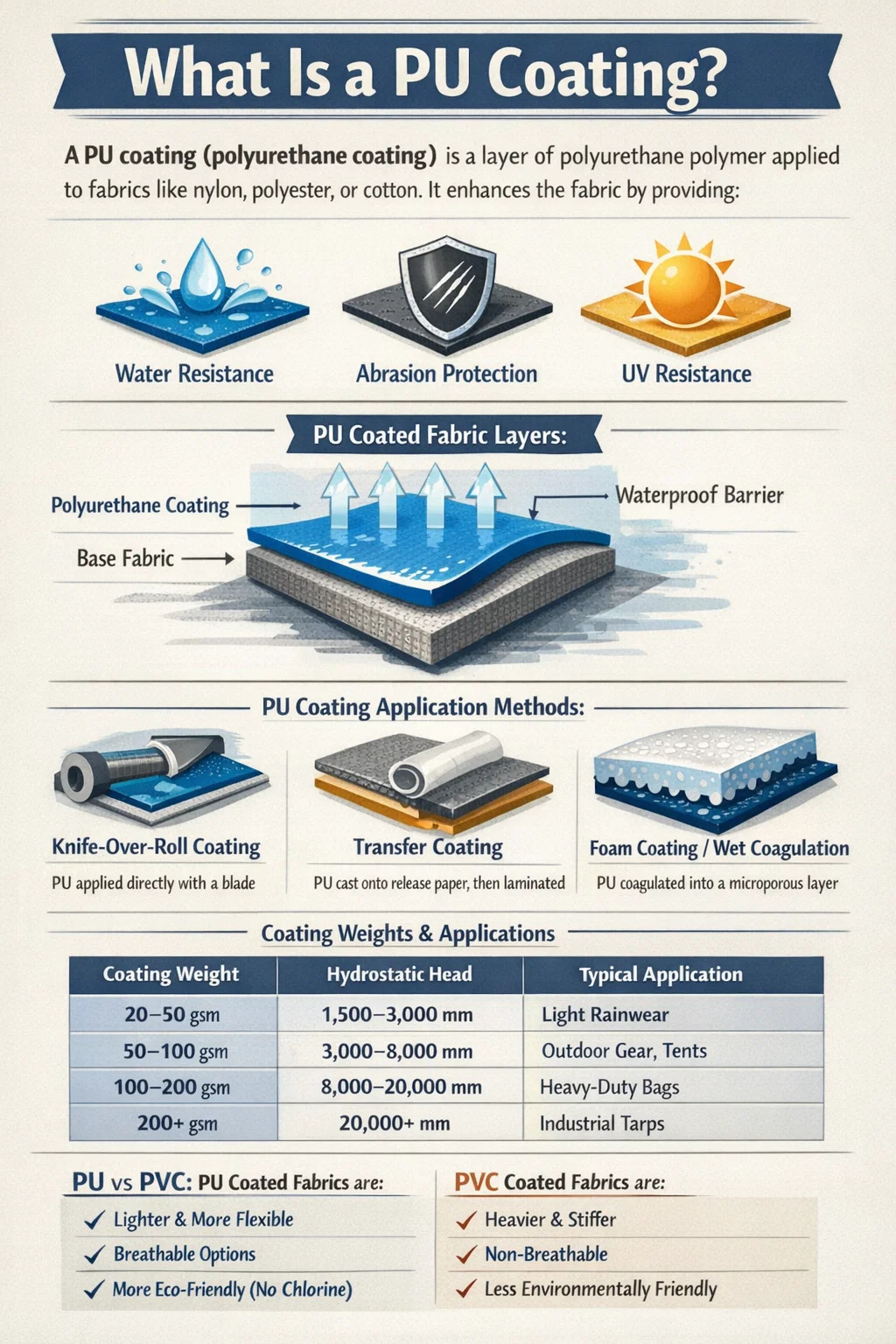 Rent praktiskt, när du hanterar ett PU-belagt tyg, rör du vid ett material som har konstruerats för att bete sig mycket annorlunda än dess obelagda motsvarighet. Polyuretanskiktet sträcker sig vanligtvis från 0,05 mm till över 1,5 mm i tjocklek , beroende på slutanvändning — ett lätt regnkläderstyg kan få en tunn beläggning på bara 20–30 gram per kvadratmeter (gsm), medan en tung industripresenning kan bära en beläggning som överstiger 200 gsm.