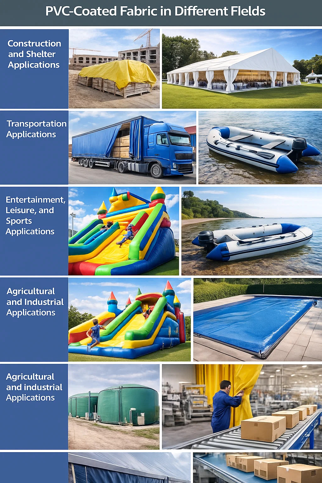 Här är några av de viktigaste användningsområdena för PVC-belagda tyger inom olika områden: