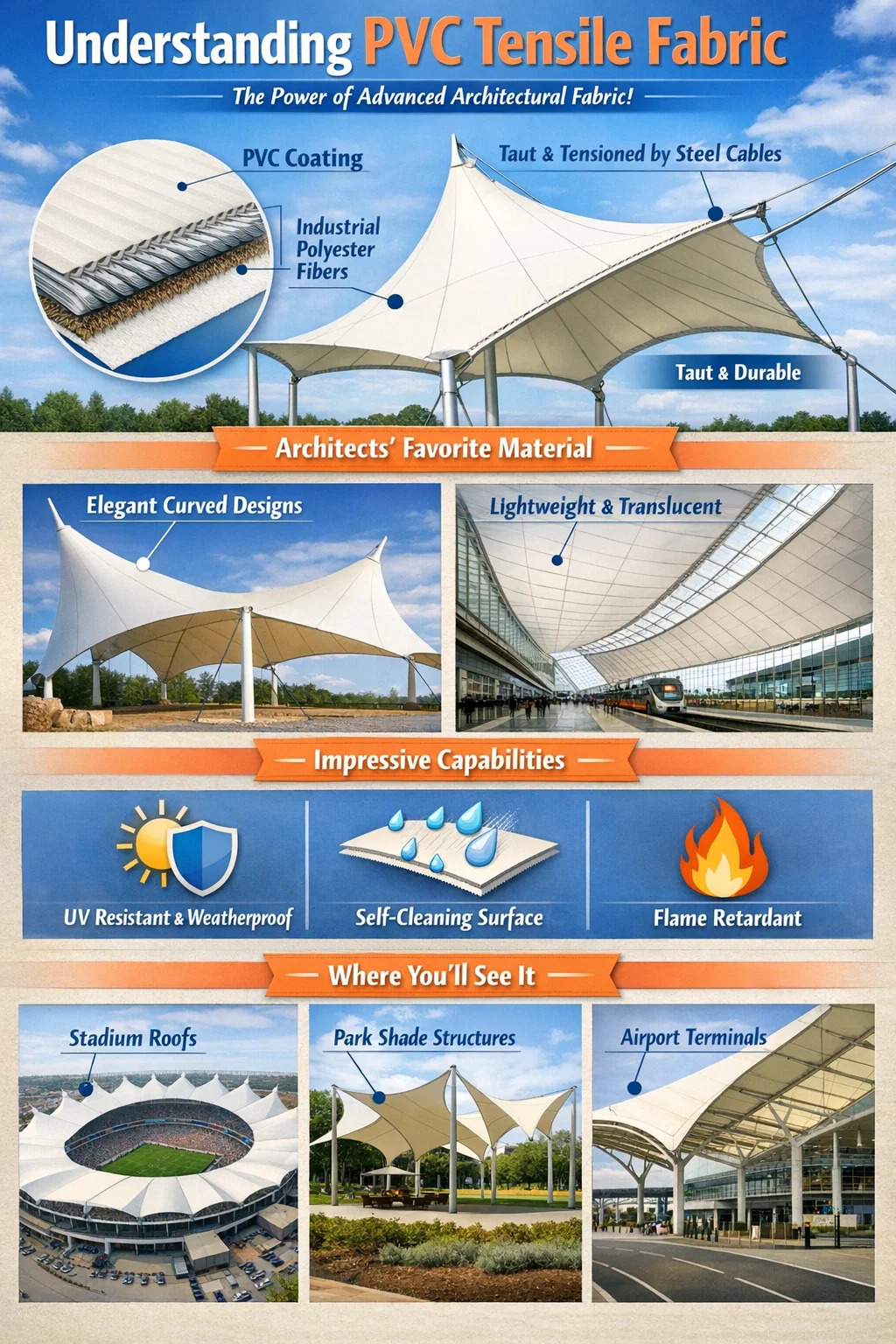 Transportknutpunkter: Många moderna höghastighetstågstationer och flygplatspassager använder denna estetiskt tilltalande membranstruktur.