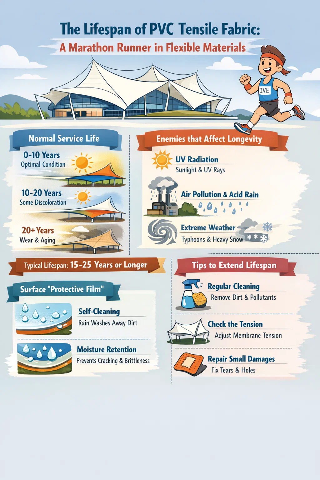 Under normalt underhåll kan högkvalitativa PVC-vävstrukturer vanligtvis hålla i 15 till 25 år, eller till och med längre.