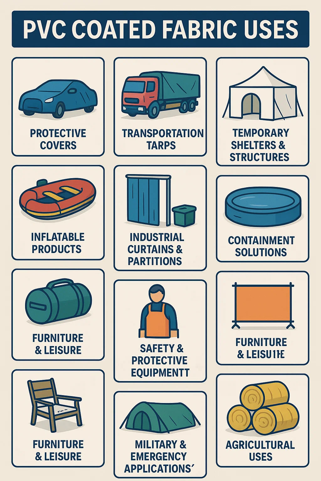 Här är en uppdelning av vanliga användningsområden för PVC-belagd väv , vilket återspeglar dess praktiska tillämpningar: